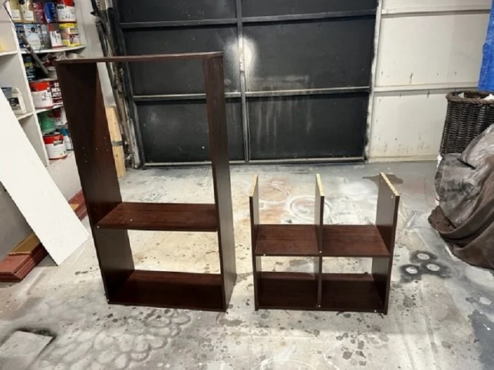 1. Prep the shelves. This step will mean different things to different people, depending on the condition of the shelves you find. Mine were in bad shape, so prepping meant taking them apart, cleaning them, sanding them, and preparing them for painting.