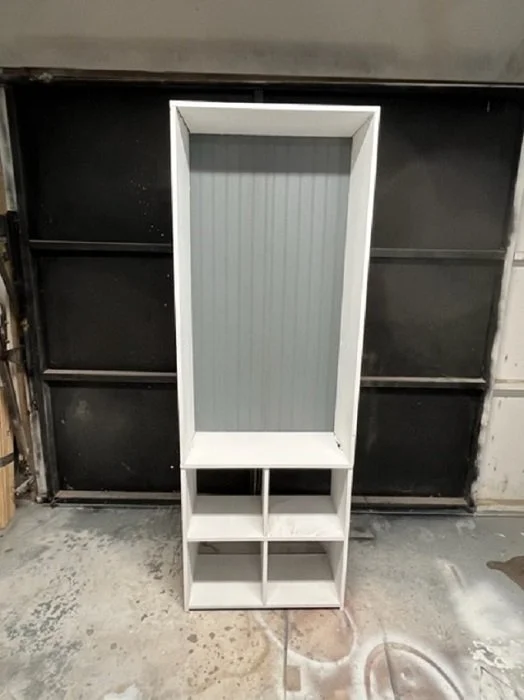 3. Put the shelves back together. (I can’t help hearing Gene Wilder’s voice in Young Frankenstein when I read that last sentence: Put the candle back.) These shelves were not assembled properly to begin with, so putting them together including making them straight – for probably the first time. I added a backer board to help give them stability. The original backing was cardboard and was literally falling off. I had beadboard left over from another project that worked quite well after being painted. Next came some molding around the top and on the front shelf to give the piece a more finished look. The bottom cubbies required no trim, which would actually impede cubby movement – and we can’t have that!