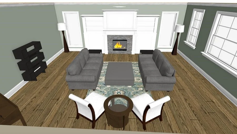 In this rendering, the focal point is the fireplace. The main furniture is set up for conversation. The two sofas balance each other out and the two chairs plus side table balance out the built-in and fireplace.