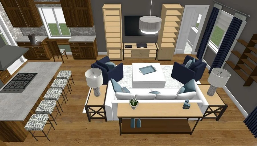 In this rendering, the focal point is the television. We have addressed both a reading area and a work area. You’ll notice some of the furniture is against the wall and some of it is actually out in the central space of the room. There is also ample room for navigating around the room.