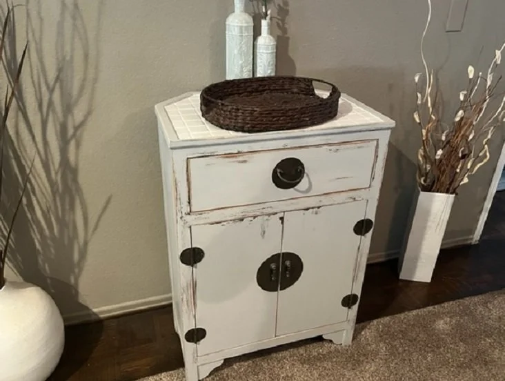 For this piece, I knew I wanted to use chalk paint to change the color, and I knew I wanted to tile the top. This particular table was also missing handles on the bottom doors, so I had to figure out what I wanted to use to replace them. I removed the doors, drawer and all the hardware for easier cleanup and painting. Next, I wiped everything down to clean off loose dirt, dust, cobwebs, etc. Finally, I lightly sanded everything to remove some small scratches and dried old paint.