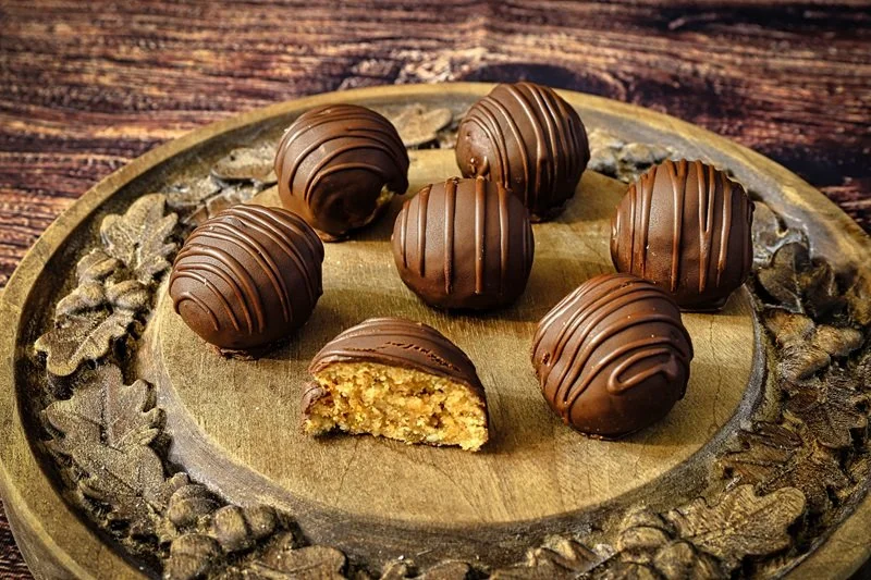 Dip set balls in chocolate and place on cooling rack. Let stand until chocolate is set. You can speed up the setting process by placing on a lined baking sheet and placing in fridge.