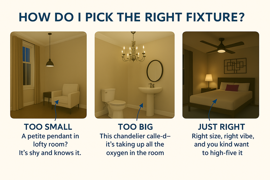 The lighting you choose should match your style and complement the room by being right-sized for the space. A petite pendant in a cathedral-ceiling room will get lost. A bold chandelier in a powder room? Overkill.